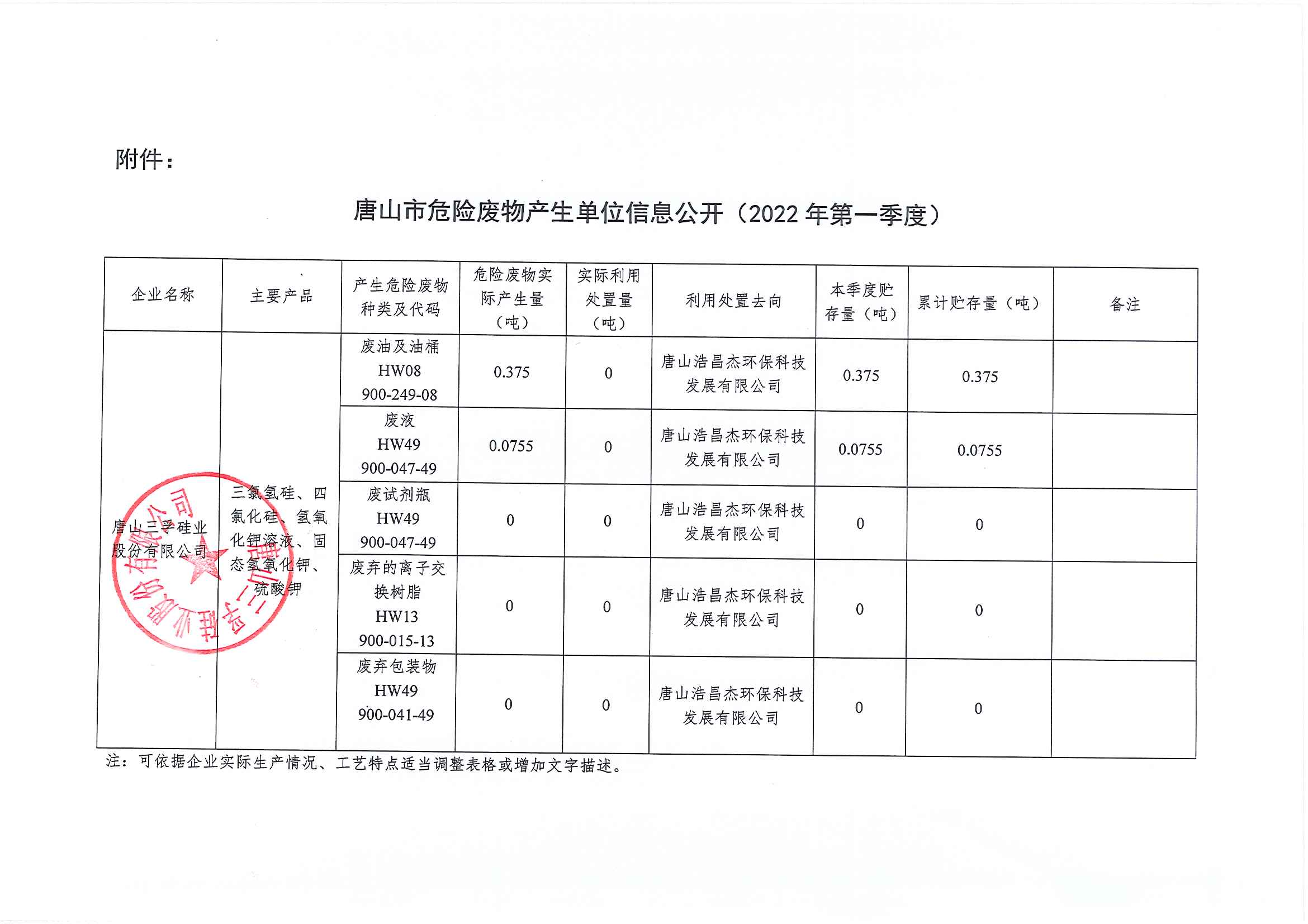 唐山三孚硅業(yè)股份有限公司2022年一季度危險(xiǎn)廢物信息公開