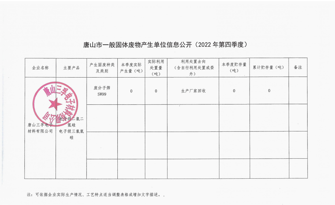 唐山三孚電子材料有限公司2022年第四季度一般固體廢物信息公開