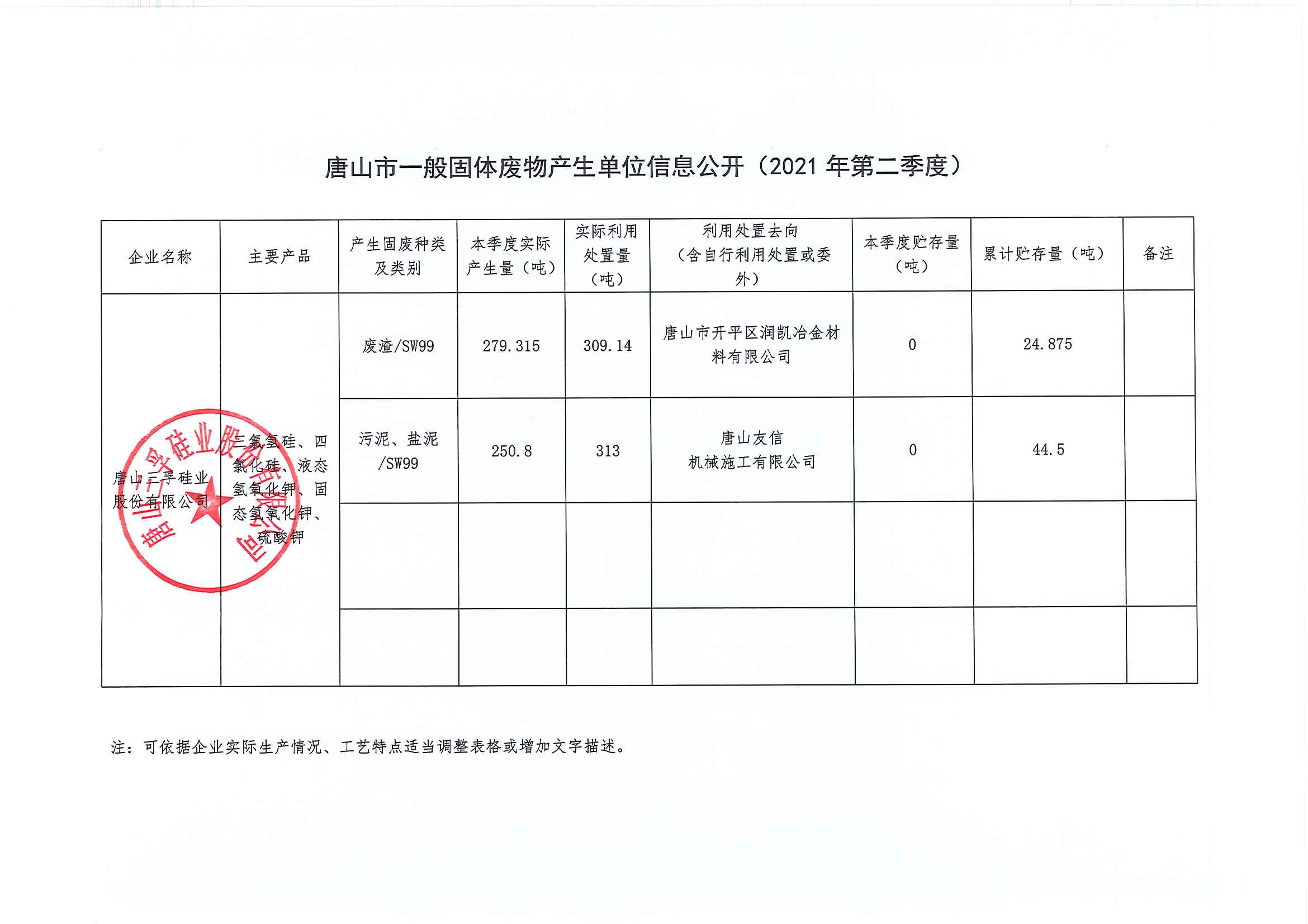 唐山三孚硅業股份有限公司 一般固廢 二季度信息公開
